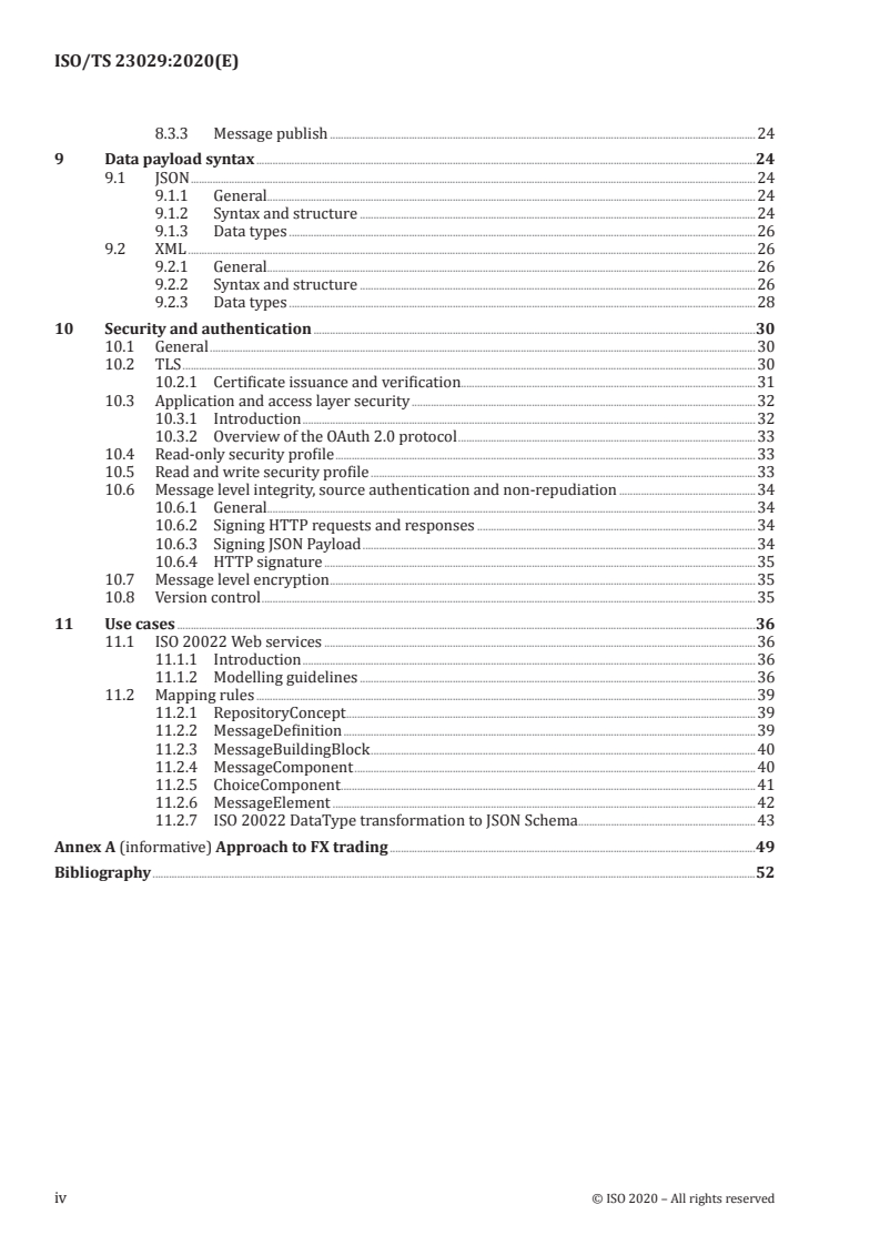 - Data payload syntax: JSON and XML syntax/structure and data type guidance, content negotiation and schema mapping (including guidance on mapping ISO 20022 models).