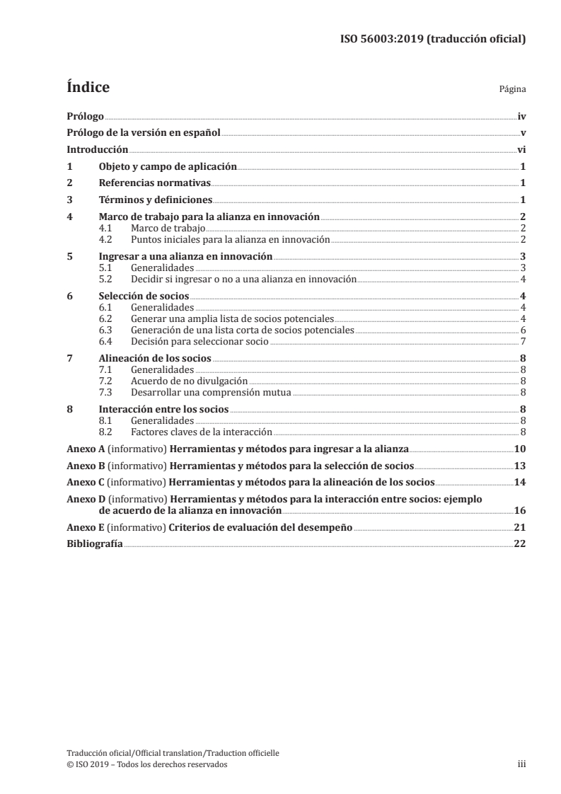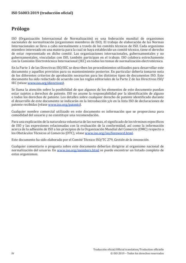 ISO 56003:2019 is a standard published by the International Organization for Standardization (ISO). Its full title is "Innovation management — Tools and methods for innovation partnership — Guidance". This standard covers: This document provides a guidance for innovation partnerships. It describes the innovation partnership framework (see Clause 4 to Clause 8) and the sample corresponding tools (see Annex A to Annex E) to — decide whether to enter an innovation partnership, — identify, evaluate and select partners, — align the perceptions of value and challenges of the partnership, — manage the partner interactions. The guidance provided by this document is relevant for any type of partnerships and collaborations and it is intended to be applicable to any organizations, regardless of its type, size, product/service provided, such as: a) start-ups collaborating with larger organizations; b) SMEs or larger organizations; c) private sector entities with public or academic entities; d) public, academic or not-for-profit organizations. Innovation partnerships start with a gap analysis, followed by the identification, and engagement, of potential innovation partners and the governance of their interaction. NOTE The essence of an innovation partnership is for all parties to mutually benefit from working together in the context of an opportunity for innovation. This document is not applicable to organizations seeking innovation by merger or acquisition.