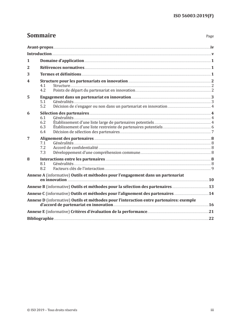 - Managing interactions and governance: Recommendations for structuring interactions, assigning responsibilities, setting governance mechanisms and using sample innovation partnership agreements (Clause 8, Annex D).