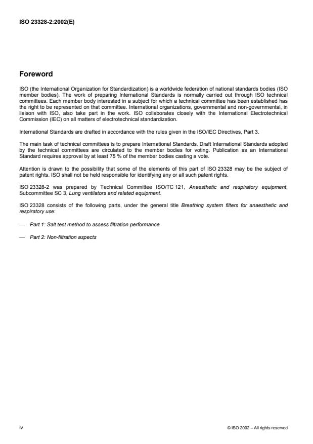 ISO 23328-2:2002 is a standard published by the International Organization for Standardization (ISO). Its full title is "Breathing system filters for anaesthetic and respiratory use - Part 2: Non-filtration aspects". This standard covers: ISO 23328-2:2002 specifies requirements for non-filtration aspects of breathing system filters (BSF) intended for anaesthetic and respiratory use, and addresses connection ports, leakage, resistance to flow, packaging, marking and information supplied. The test method is intended for BSF used with a clinical breathing system. It is not applicable to other types of filter, e.g. those designed to protect vacuum sources or gas sample lines, to filter compressed gases, or to protect test equipment for physiological respiratory measurements. A method for assessing filtration performance of BSF is given in ISO 23328-1.