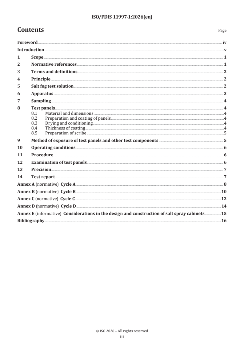ISO/FDIS 11997-1 - Paints and varnishes — Determination of resistance to cyclic corrosion conditions — Part 1: Wet (salt fog)/dry/humid Released:21. 01. 2026