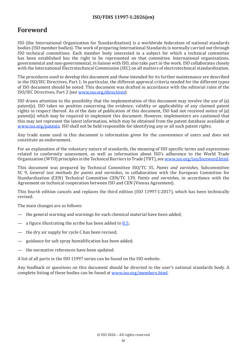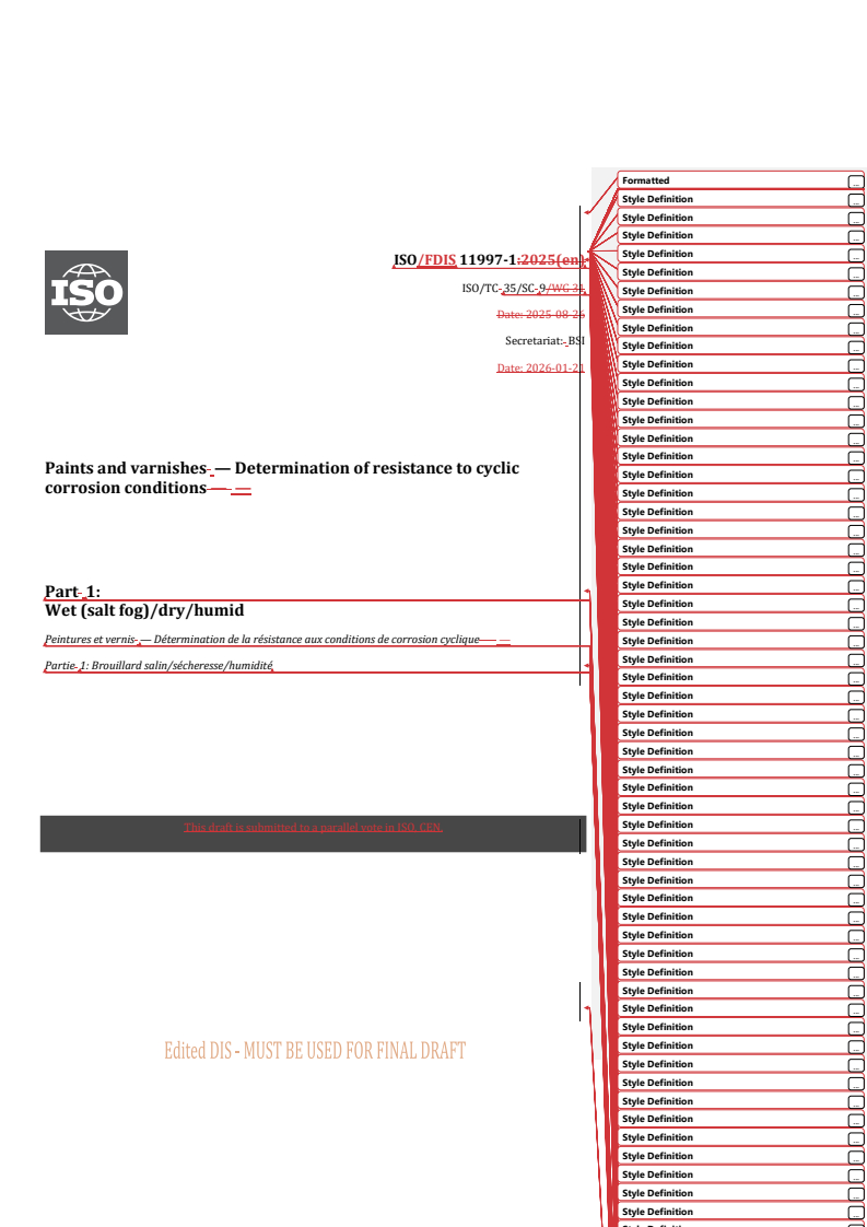 REDLINE ISO/FDIS 11997-1 - Paints and varnishes — Determination of resistance to cyclic corrosion conditions — Part 1: Wet (salt fog)/dry/humid Released:21. 01. 2026