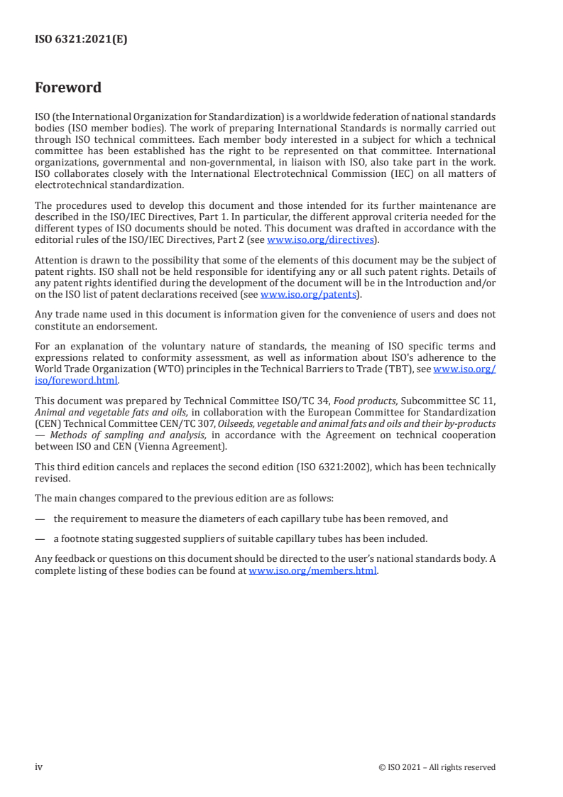 Keywords: ISO 6321:2021, slip melting point, melting point determination, open capillary tubes, animal and vegetable fats and oils, Method A, Method B, palm oil, polymorphism, capillary tube dimensions, laboratory method.