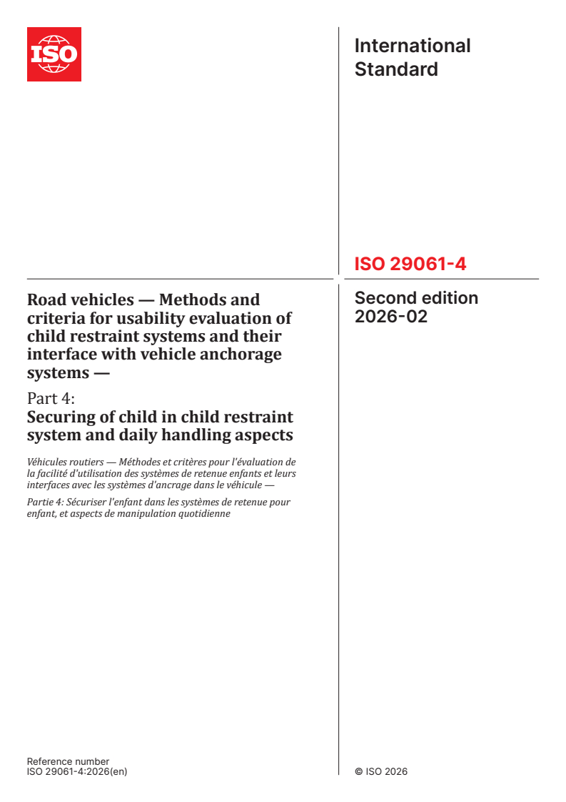ISO 29061-4:2026 - Road vehicles — Methods and criteria for usability evaluation of child restraint systems and their interface with vehicle anchorage systems — Part 4: Securing of child in child restraint system and daily handling aspects Released:6. 02. 2026
