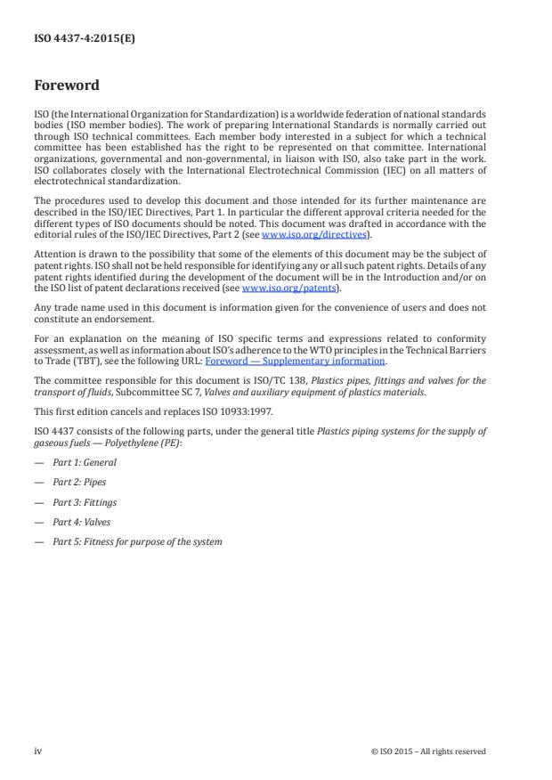 ISO 4437-4:2015 specifies the characteristics of valves made from polyethylene (PE) for piping systems in the field of the supply of gaseous fuels. It also specifies the test parameters for the test methods referred to in this part of ISO 4437.
