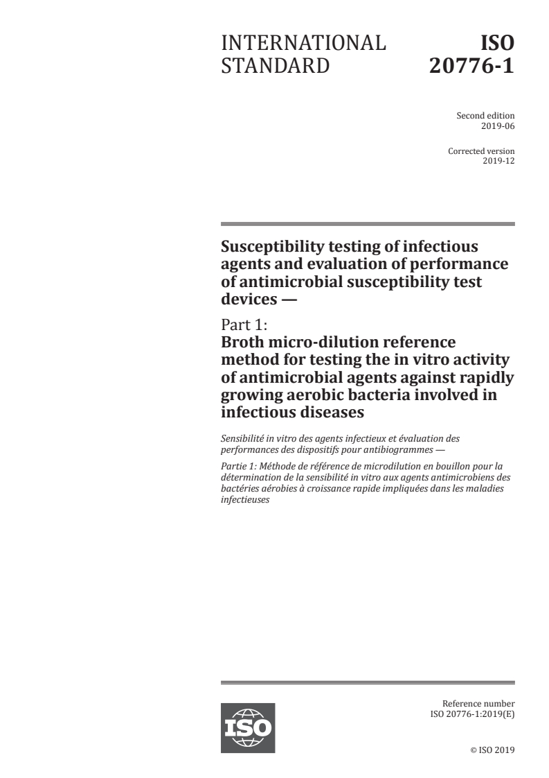 ISO 20776-1:2019 - Susceptibility testing of infectious agents and evaluation of performance of antimicrobial susceptibility test devices — Part 1: Broth micro-dilution reference method for testing the in vitro activity of antimicrobial agents against rapidly growing aerobic bacteria involved in infectious diseases Released:12/12/2019