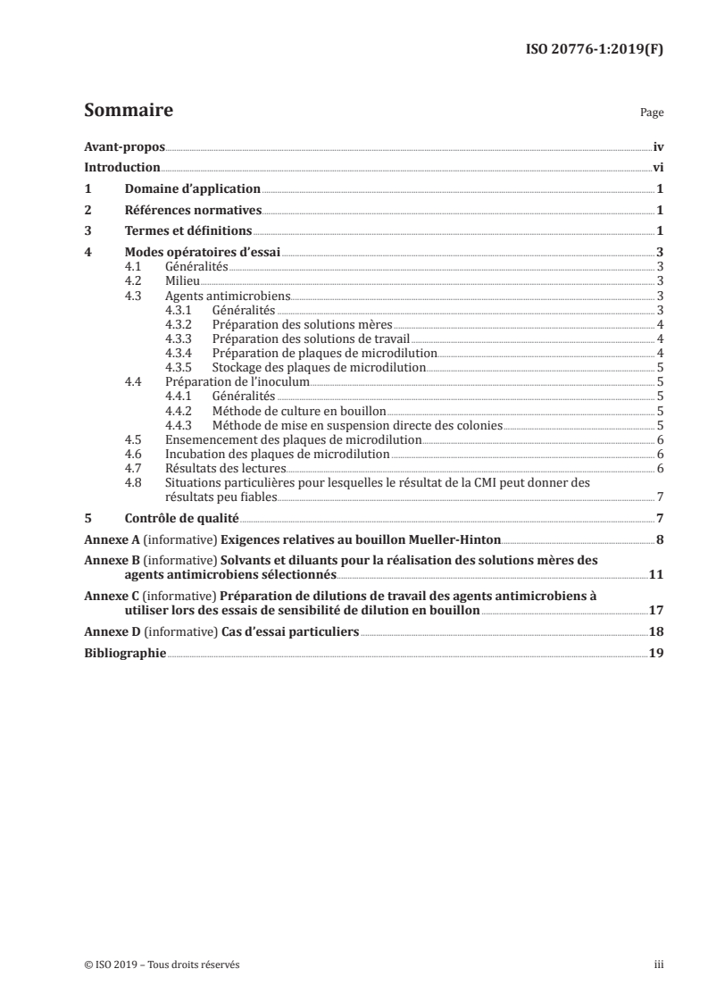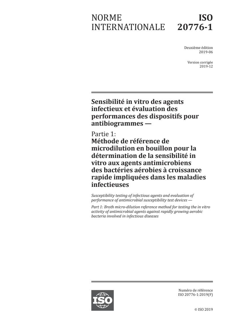 ISO 20776-1:2019 - Sensibilité in vitro des agents infectieux et évaluation des performances des dispositifs pour antibiogrammes — Partie 1: Méthode de référence de microdilution en bouillon pour la détermination de la sensibilité in vitro aux agents antimicrobiens des bactéries aérobies à croissance rapide impliquées dans les maladies infectieuses Released:12/12/2019