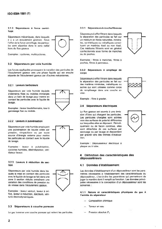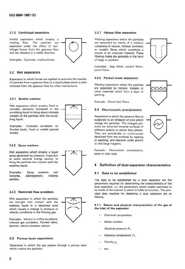 ISO 6584:1981 is a standard published by the International Organization for Standardization (ISO). Its full title is "Cleaning equipment for air and other gases — Classification of dust separators". This standard covers: Defines a classification of dust separators, gives their operating principles and defines their characteristics. Examples are given of each class of dust separator, but this list is not exhaustive. Symbols are given for each class of dust separator and these shall be used as the basis for symbols for more complex types of separator.