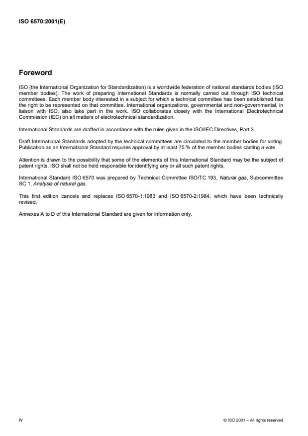 ISO 6570:2001 is a standard published by the International Organization for Standardization (ISO). Its full title is "Natural gas — Determination of potential hydrocarbon liquid content — Gravimetric methods". This standard covers: This International Standard describes the principles of, and general requirements for, two gravimetric methods for the determination of the potential hydrocarbon liquid content of natural gas, or similar gas, at a given pressure and temperature. Two methods are specified in this International Standard to determine the amount of condensate in a sample gas: _ Method A: a manual weighing method; _ Method B: an indirect automatic weighing method based on the indication of the pressure difference caused by the accumulation of condensate in a vertical tube. The manual weighing method is a reference method for the indirect automatic method (Method B). The indirect automatic method (Method B) is suitable for semi-continuous control. NOTE Unless otherwise specified, gas volumes are in cubic metres at 273,15 K and 101,325 kPa.
