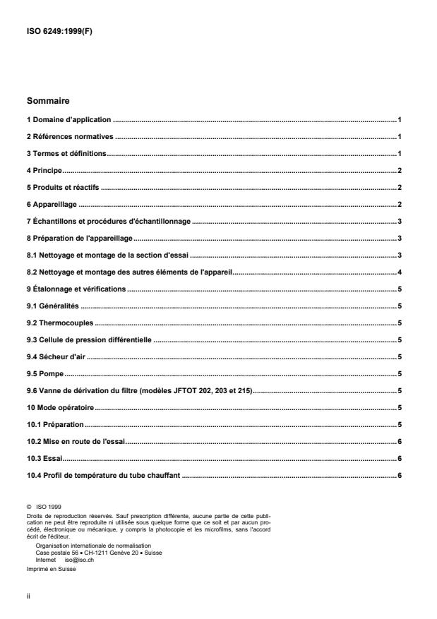 ISO 6249:1999 is a standard published by the International Organization for Standardization (ISO). Its full title is "Petroleum products — Determination of thermal oxidation stability of gas turbine fuels — JFTOT method". This standard covers: La présente Norme internationale spécifie une méthode pour évaluer les tendances des carburants pour turbines à gaz à former des dépôts de produits de décomposition à l'intérieur des circuits de carburant. Cette méthode est applicable aux distillats moyens et aux carburants à coupe large, et elle est particulièrement prescrite pour évaluer les performances des carburéacteurs.Les résultats de l'essai sont représentatifs de la stabilité du carburant pendant le fonctionnement sur turbine à gaz et peuvent être utilisés pour évaluer le niveau de dépôts formés lorsque le carburant liquide entre en contact avec une surface chaude qui est à une température prescrite.