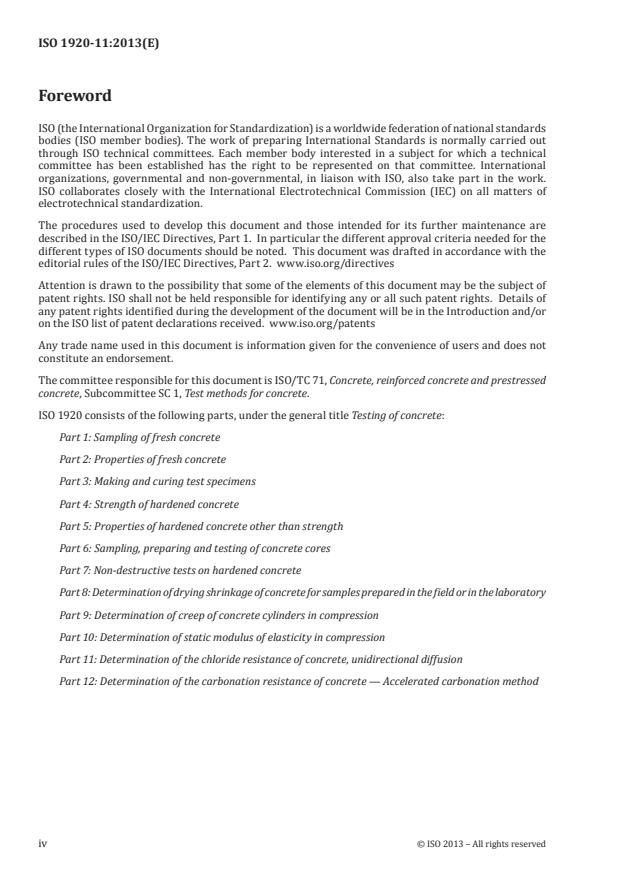 ISO 1920-11:2013 is a standard published by the International Organization for Standardization (ISO). Its full title is "Testing of concrete — Part 11: Determination of the chloride resistance of concrete, unidirectional diffusion". This standard covers: ISO 1920-11:2013 specifies a method for determining the unidirectional non-steady-state chloride penetration parameters of conditioned specimens of hardened concrete. The test method enables the determination of the chloride penetration at a specified age, e.g. for ranking of concrete quality by comparative testing.