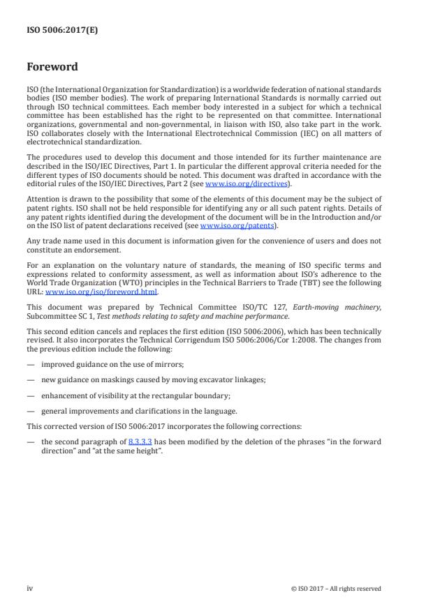 ISO 5006:2017 is a standard published by the International Organization for Standardization (ISO). Its full title is "Earth-moving machinery - Operator's field of view - Test method and performance criteria". This standard covers: ISO 5006:2017 specifies a static test method for determining and evaluating the operator's field of view on a rectangular boundary around the machine and on a 12 m visibility test circle (VTC). It is applicable to the earth-moving machines as defined in ISO 6165 that have a seated operator, and which are intended to operate on work sites and travel on public roads. It provides visibility performance criteria for machines up to the maximum operating mass according to ISO 6016, depending on the type of machine family listed in Table 1. For those machines not listed ? including larger machines, derivative and other types of earth-moving machinery ? the visibility test procedures can be used along with the risk assessment process defined in 10.4.