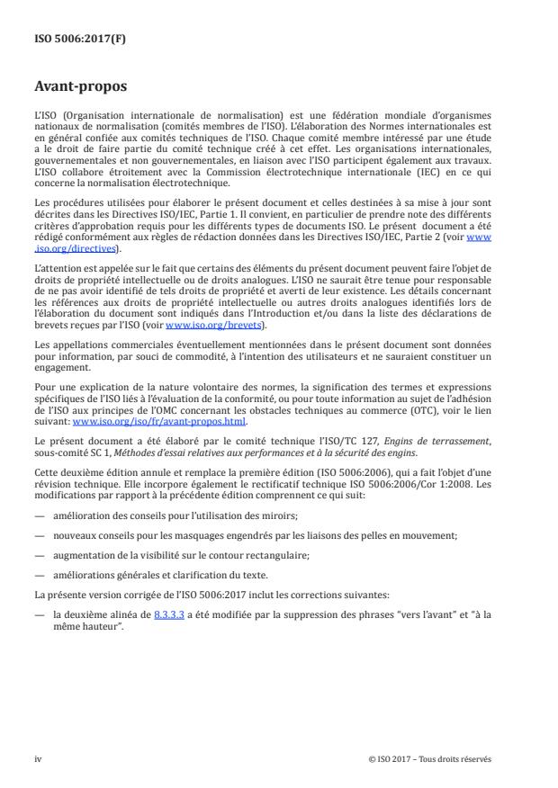 ISO 5006:2017 specifies a static test method for determining and evaluating the operator's field of view on a rectangular boundary around the machine and on a 12 m visibility test circle (VTC). It is applicable to the earth-moving machines as defined in ISO 6165 that have a seated operator, and which are intended to operate on work sites and travel on public roads. It provides visibility performance criteria for machines up to the maximum operating mass according to ISO 6016, depending on the type of machine family listed in Table 1. For those machines not listed ? including larger machines, derivative and other types of earth-moving machinery ? the visibility test procedures can be used along with the risk assessment process defined in 10.4.