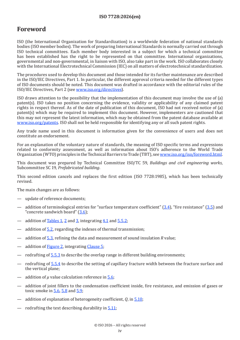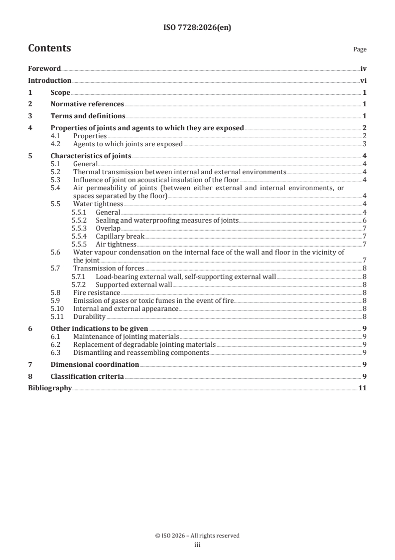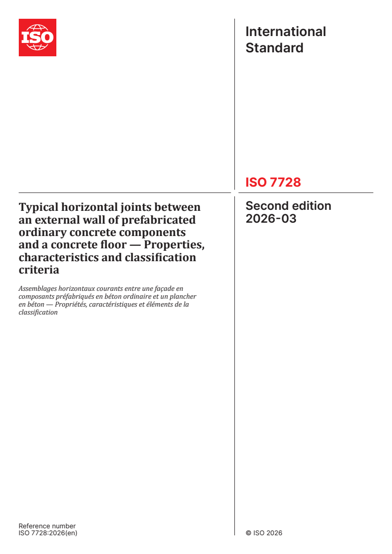 ISO 7728:2026 is a standard published by the International Organization for Standardization (ISO). Its full title is "Typical horizontal joints between an external wall of prefabricated ordinary concrete components and a concrete floor — Properties, characteristics and classification criteria". This standard covers: This document specifies the properties and characteristics of typical horizontal joints between two prefabricated ordinary concrete external wall components and a concrete floor. However, the characteristics of joints, which are involved in the structural behaviour of buildings, are not specified in this document. This document is applicable to all public or private buildings, used as dwellings, offices, educational or hospital premises.