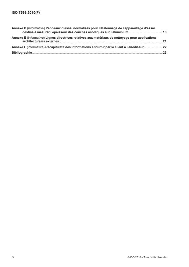 ISO 7599:2010 lays down a method for specifying decorative and protective anodic oxidation coatings on aluminium (including aluminium-based alloys). It defines the characteristic properties of anodic oxidation coatings, lists methods of test for checking the characteristic properties, provides minimum performance requirements, and gives information on the grades of aluminium suitable for anodizing and the importance of pretreatment to ensure the required appearance or texture of the finished work. It is not applicable to non-porous oxidation coatings of the barrier layer type, oxidation coatings produced by chromic acid or phosphoric acid anodizing, oxidation coatings intended merely to prepare the substrate for subsequent application of organic coatings or electrodeposition of metals, or hard anodic oxidation coatings used mainly for engineering purposes, for which abrasion and wear resistance are the primary characteristics (see ISO 10074).