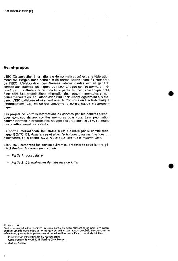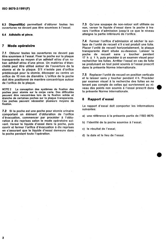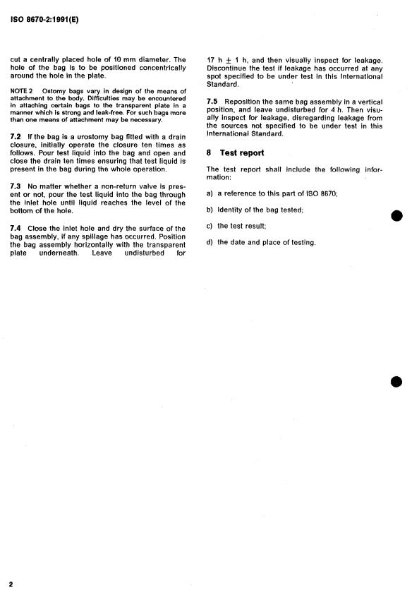 ISO 8670-2:1991 is a standard published by the International Organization for Standardization (ISO). Its full title is "Ostomy collection bags — Part 2: Determination of freedom from leakage". This standard covers: Ostomy collection bags — Part 2: Determination of freedom from leakage