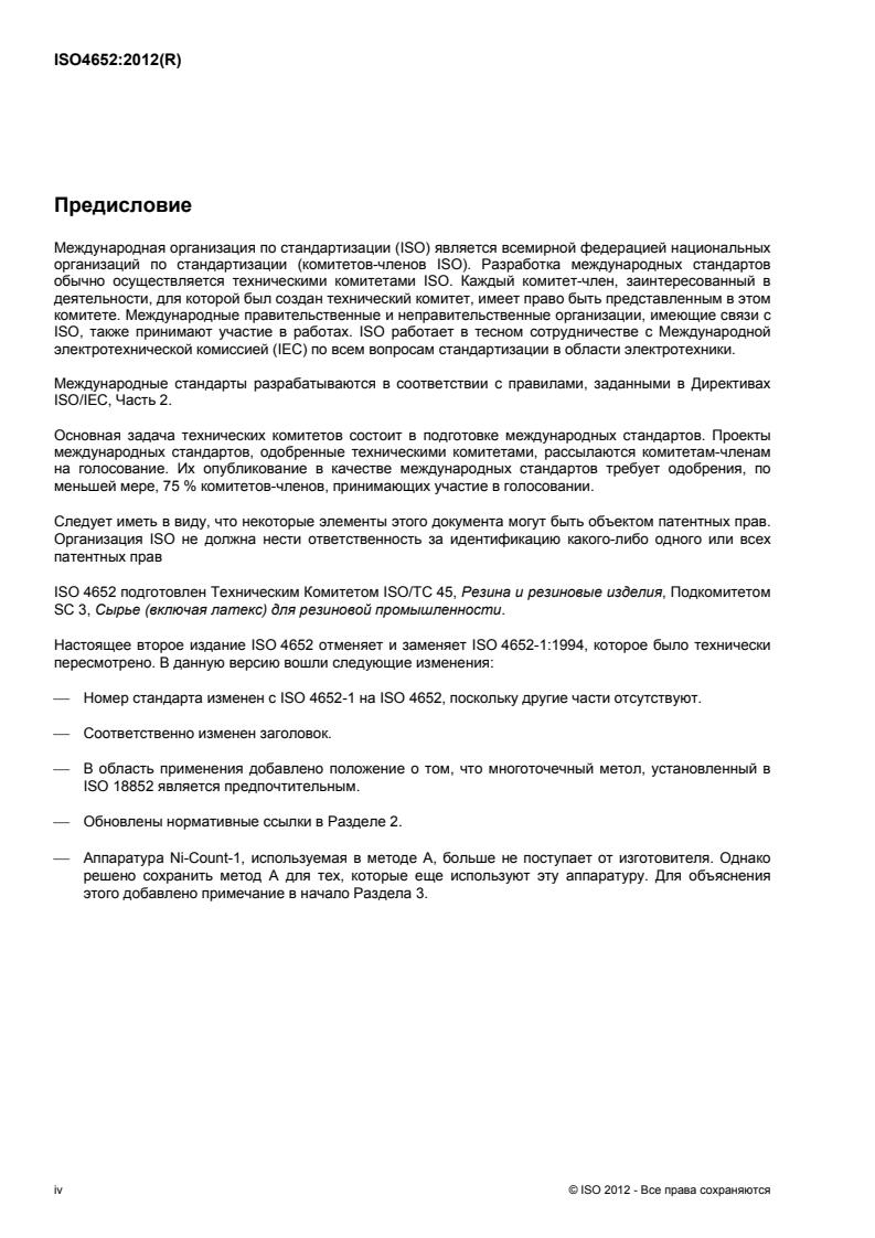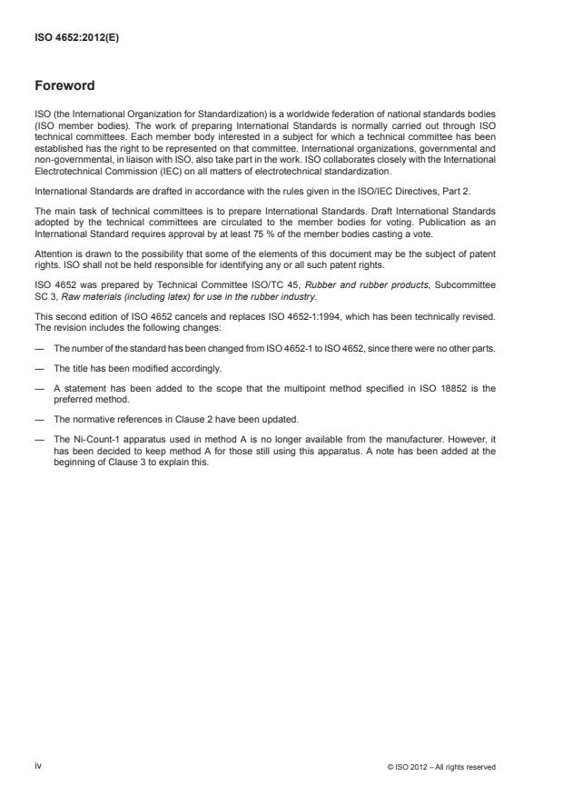 ISO 4652:2012 is a standard published by the International Organization for Standardization (ISO). Its full title is "Rubber compounding ingredients — Carbon black — Determination of specific surface area by nitrogen adsorption methods — Single-point procedures". This standard covers: This International Standard specifies four methods for the determination of the specific surface area of types and grades of carbon black for use in the rubber industry: — method A using the Ni‑Count‑1 apparatus (Clause 3); — method B using the Areameter apparatus (Clause 4); — method C using gas chromatography (Clause 5); — method D using the Monosorb surface-area analyser (Clause 6). Somewhat different results might be obtained from the four methods. The degassing procedure used differs from method to method, and it is important to investigate the possibility of correcting the results by using standard reference blacks. The results might also differ from those obtained using the multipoint method specified in ISO 18852, which is the preferred method.