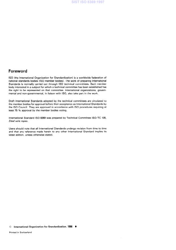 ISO 8369:1986 is a standard published by the International Organization for Standardization (ISO). Its full title is "Large diameter steel wire ropes". This standard covers: Specifies a range of steel wire ropes having a nominal diameter between 64 and 205 mm. For smaller nominal diameters see ISO 2408. Unless a specific request is made by the purchaser, the choice of construction within a group shall be left to the supplier's discretion. Ropes for mine winding and airial transportation purposes are not dealt with.