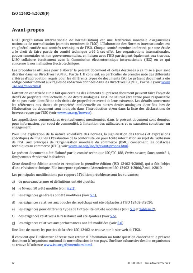 ISO 12402-4:2020 is a standard published by the International Organization for Standardization (ISO). Its full title is "Personal flotation devices - Part 4: Lifejackets, performance level 100 - Safety requirements". This standard covers: This document specifies the safety requirements for lifejackets, performance level 100. It is applicable to lifejackets used by adults, children and infants, for use in sheltered or calm water, or when the users are fully clothed.