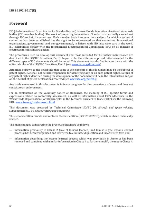 ISO 16192:2017 is a standard published by the International Organization for Standardization (ISO). Its full title is "Space systems — Experience gained in space projects (lessons learned) — Principles and guidelines". This standard covers: ISO 16192:2017 outlines lessons learned principles and guidelines that are applicable in all space project activities (management, technical, quality, cost and schedule). The application of this document is intended to be included in the supplier quality management system, but can be tailored in individual contracts as agreed by the customer and supplier, depending on: - the content of each project (size, technological level and novelty, particular organization, participants, etc.); - the interest and usefulness of the related information. The lessons learned information can result from any situation which might be encountered in similar contexts for future projects, i.e.: - undesirable experiences that need to be avoided; - strategies, rules, principles of design, validation, tests and operations that proved to be successful or necessary. ISO 16192:2017 neither endorses nor recommends the transmission of company proprietary information to external entities as part of a lessons learned process. Implementing a formal lessons learned process as outlined in this document makes it possible to capture and benefit from this information. The lessons learned activity is an important contribution to the processing of the preventive and corrective actions specified in ISO 9001 and ISO 17666. ISO 16192:2017 also provides lessons learned processes and suggested lessons learned forms.