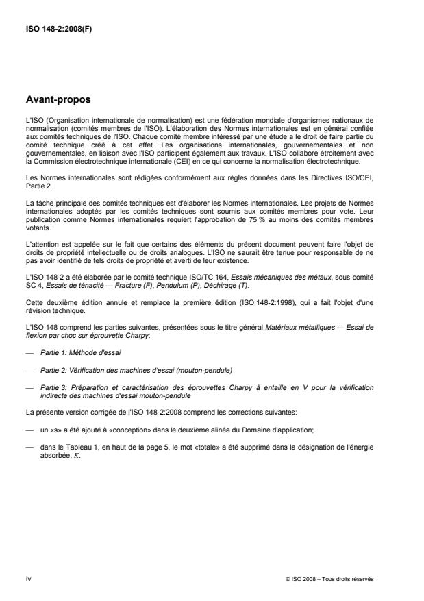 L'ISO 148-2:2008 traite de la vérification des éléments des machines d'essai de flexion par choc (moutons-pendules). Elle s'applique aux machines ayant des couteaux de 2 mm ou de 8 mm utilisées pour les essais de flexion par choc effectués par exemple conformément à l'ISO 148-1. Elle peut s'appliquer de manière analogue aux moutons-pendules de capacités ou de conception différentes. Les machines de choc utilisées pour les essais des matériaux métalliques par des laboratoires industriels, généralistes ou de recherche conformément à l'ISO 148-2:2008 sont qualifiées de machines industrielles. Celles répondant à des exigences plus contraignantes sont qualifiées de machines de référence. Les exigences relatives à la vérification des machines de référence sont fixées dans l'ISO 148-3. L'ISO 148-2:2008 décrit deux méthodes de vérification: une méthode directe et une méthode indirecte.
