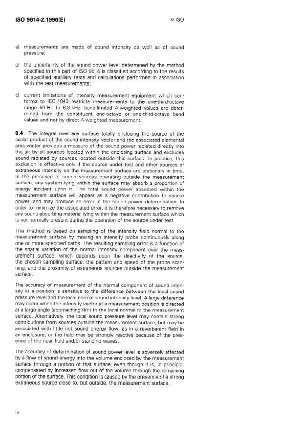 ISO 9614-2:1996 specifies a method to determine sound power levels of noise sources using sound intensity measured by scanning. The standard requires measuring the component of sound intensity normal to a measurement surface that wholly encloses the source. The surface integral of this normal intensity gives the total sound power radiated into the air. Scanning may be performed manually or by mechanical systems; instruments record the segment-average normal intensity and averaged squared sound pressure.
