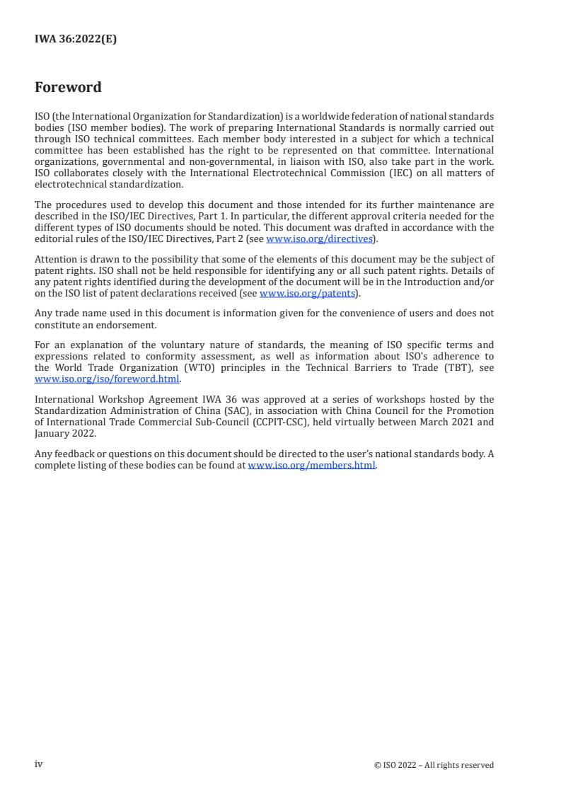 IWA 36:2022 is a standardization document published by the International Organization for Standardization (ISO). Its full title is "Guidelines for contactless delivery services". This standard covers: This document provides general guidance on issues to be considered in standards related to contactless delivery services. It covers general principles, roles and responsibilities, delivery methods, service processes, quality control and improvements to be put in place to execute contactless delivery services. This document applies to — instant delivery, which generally applies to the retail, catering and medical sectors (including online food delivery, grocery delivery and medical supplies delivery); and — last-mile delivery with intermediate transfer, which generally applies to express and e-commerce fields (referring to the last-mile delivery of parcels). This document does not apply to cold chain logistics.