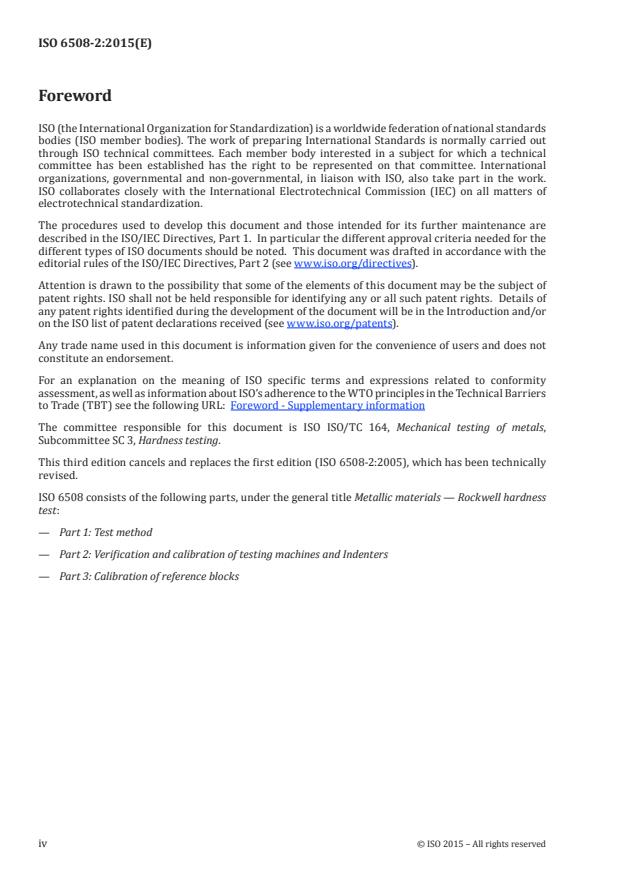 ISO 6508-2:2015 is a standard published by the International Organization for Standardization (ISO). Its full title is "Metallic materials — Rockwell hardness test — Part 2: Verification and calibration of testing machines and indenters". This standard covers: ISO 6508-2:2015 specifies two separate methods of verification of testing machines (direct and indirect) for determining Rockwell hardness in accordance with ISO 6508‑1:2015, together with a method for verifying Rockwell hardness indenters. The direct verification method is used to determine whether the main parameters associated with the machine function, such as applied force, depth measurement, and testing cycle timing, fall within specified tolerances. The indirect verification method uses a number of calibrated reference hardness blocks to determine how well the machine can measure a material of known hardness. The indirect method may be used on its own for periodic routine checking of the machine in service. If a testing machine is also to be used for other methods of hardness testing, it shall be verified independently for each method. ISO 6508-2:2015 is applicable to stationary and portable hardness testing machines. Attention is drawn to the fact that the use of tungsten carbide composite for ball indenters is considered to be the standard type of Rockwell indenter ball. Steel indenter balls may continue to be used only when complying with ISO 6508‑1:2015, Annex A.