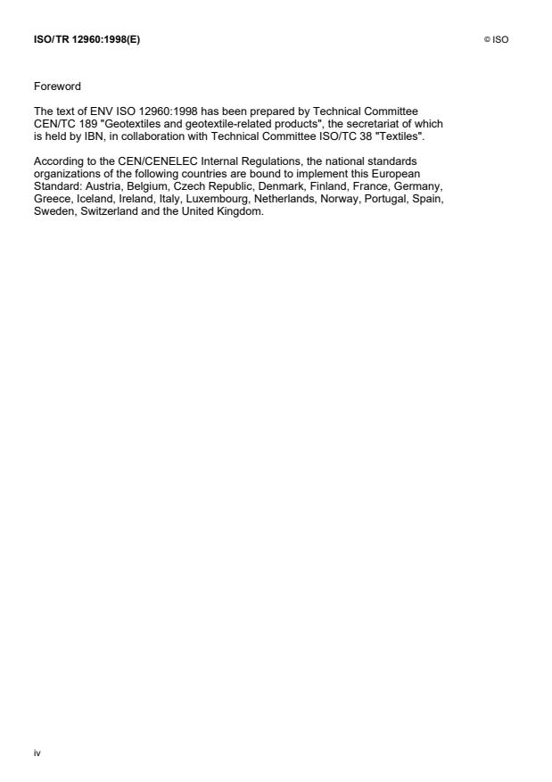 ISO/TR 12960:1998 is classified under the following ICS (International Classification for Standards) categories: 59.080.70 - Geotextiles. The ICS classification helps identify the subject area and facilitates finding related standards.