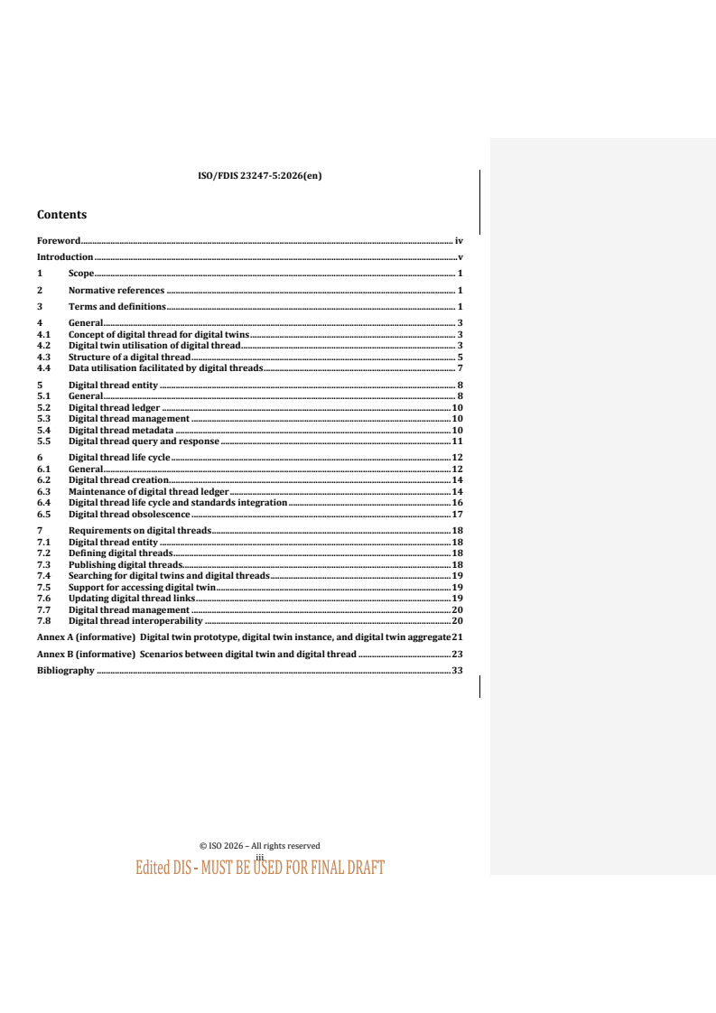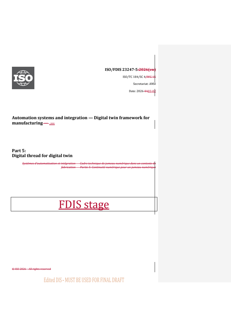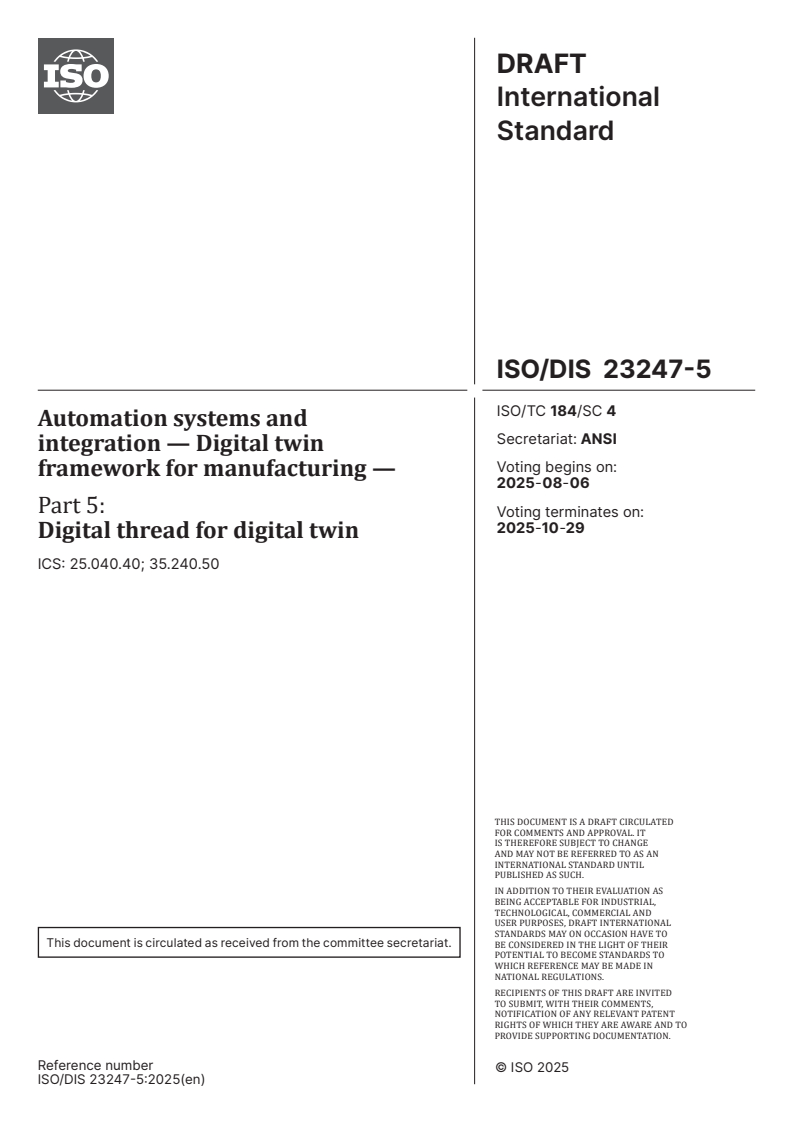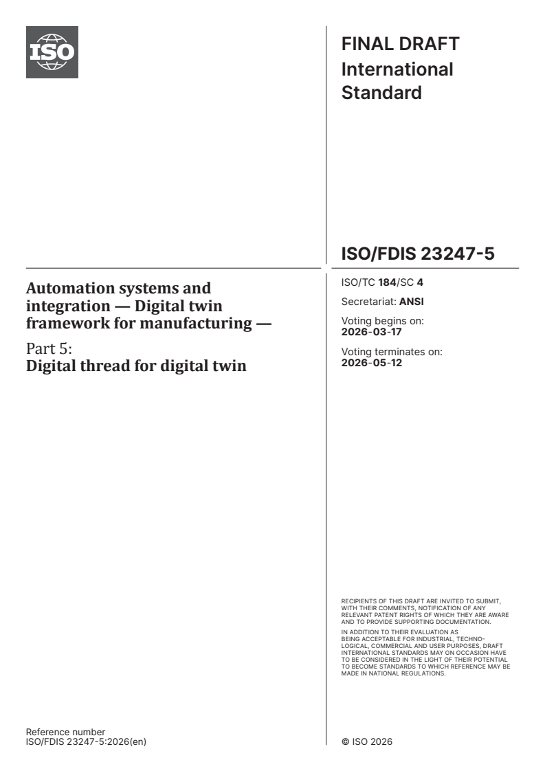 ISO/FDIS 23247-5 - Automation systems and integration — Digital twin framework for manufacturing — Part 5: Digital thread for digital twin/11/2025