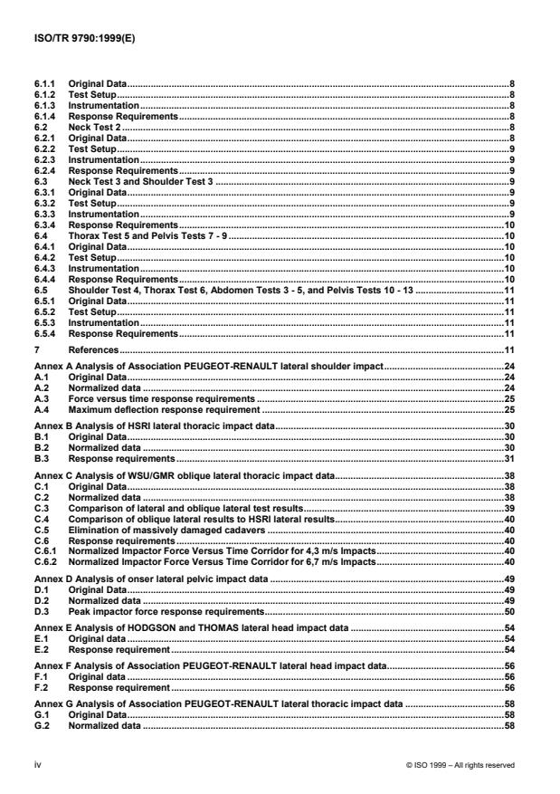 Keywords: ISO/TR 9790:1999, anthropomorphic side impact dummy, lateral impact response, biofidelity, crash test dummies, 50th percentile adult male, pendulum impacts, sled tests, lateral drops.