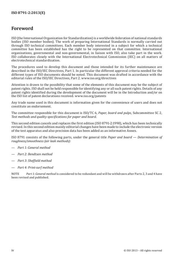 ISO 8791-2:2013 specifies a method for the determination of the roughness of paper and board using the Bendtsen apparatus. ISO 8791-2:2013 is applicable to paper and board which have Bendtsen roughness values between about 5 ml/min and 3 000 ml/min when measured with variable-area type testers and between about 50 ml/min and 5 000 ml/min when measured with electronic type testers. It is not suitable for soft papers which allow the land to make a significant impression on the surface or for high-air-permeance papers which allow a significant flow of air to pass through the sheet, or for papers which will not lie flat under the measuring head.