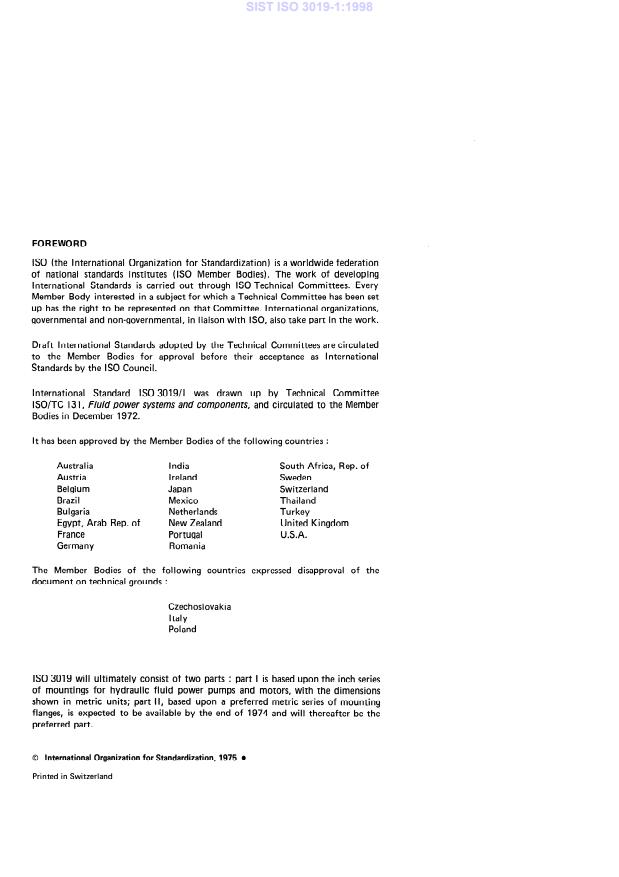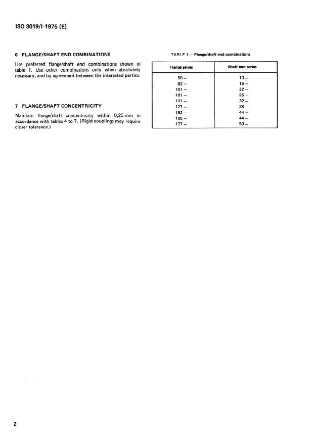 ISO 3019-1:1975 is a standard published by the International Organization for Standardization (ISO). Its full title is "Hydraulic fluid power — Positive displacement pumps and motors — Dimensions and identification code for mounting flanges and shaft ends — Part 1: Inch series shown in metric units". This standard covers: Hydraulic fluid power — Positive displacement pumps and motors — Dimensions and identification code for mounting flanges and shaft ends — Part 1: Inch series shown in metric units