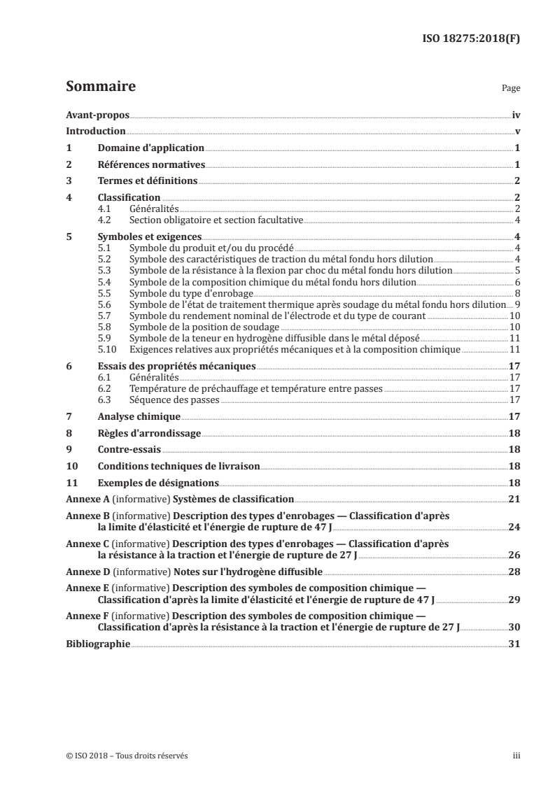 - Chemical composition: Symbols and limits for deposited metal composition are specified to classify consumables.
