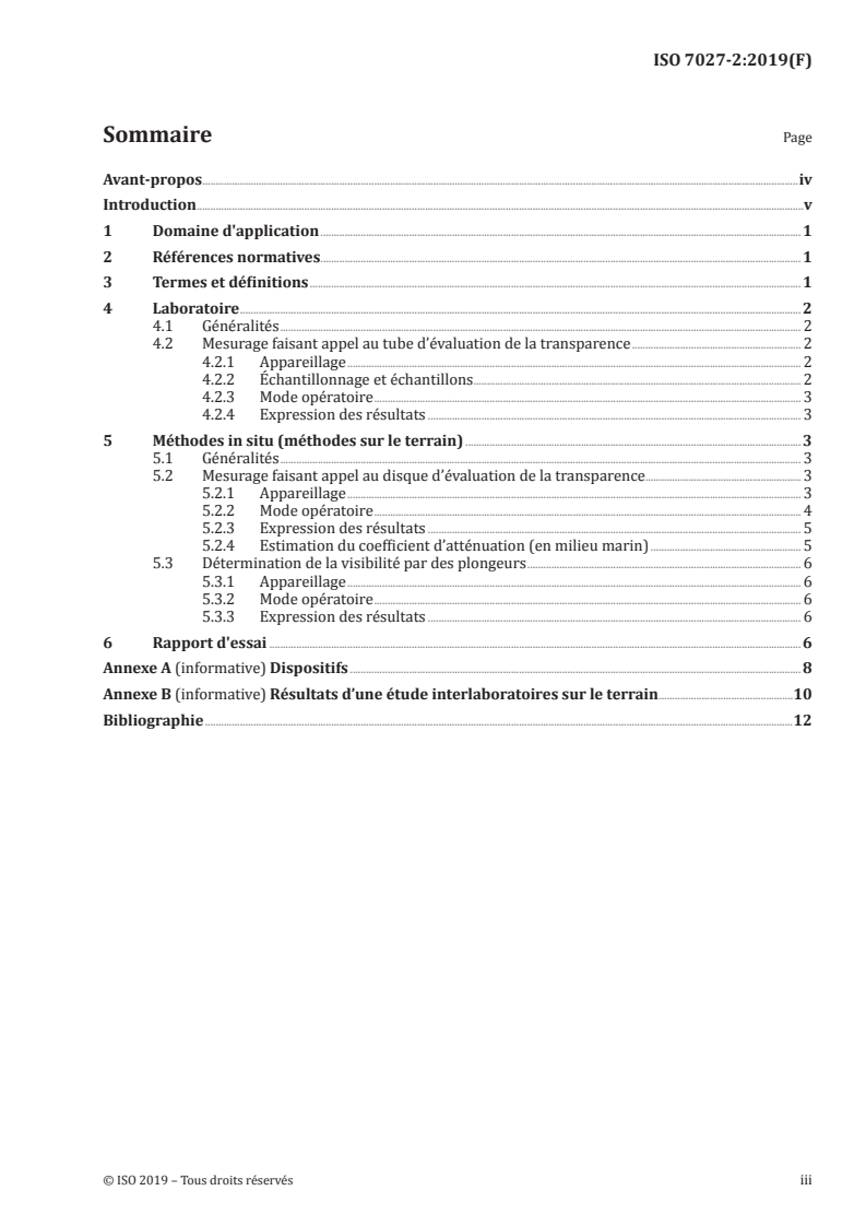 ISO 7027-2:2019 is a standard published by the International Organization for Standardization (ISO). Its full title is "Water quality — Determination of turbidity — Part 2: Semi-quantitative methods for the assessment of transparency of waters". This standard covers: This document specifies the following semi-quantitative methods for the assessment of transparency of waters: a) measurement of visual range using the transparency testing tube (applicable to transparent and slightly cloudy water), see Clause 4; b) measurement of visual range in the upper water layers using the transparency testing disc (especially applicable to surface, bathing water, waste water and often used in marine monitoring), see 5.1; c) measurement of visibility by divers in a destined depth, see 5.2. NOTE The quantitative methods using optical turbidimeters or nephelometers are described in ISO 7027-1.
