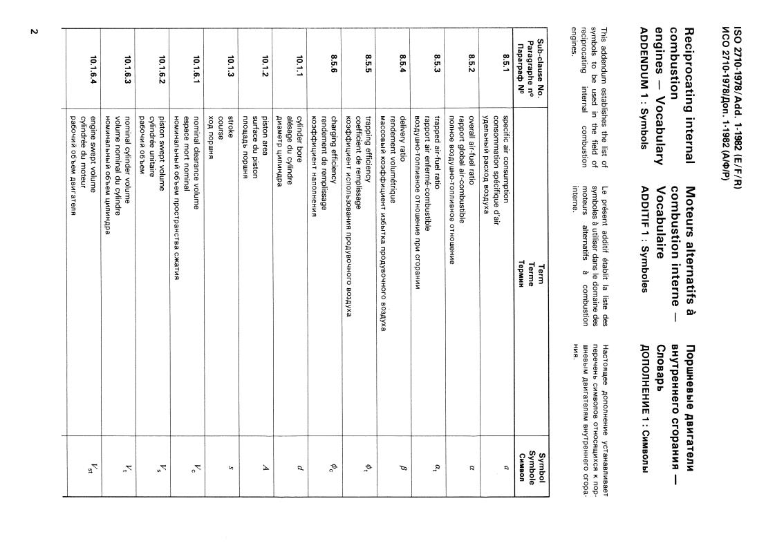 ISO 2710:1978/Add 1:1982 is a standard published by the International Organization for Standardization (ISO). Its full title is "Reciprocating internal combustion engines — Vocabulary — Addendum 1: Symbols". This standard covers: Reciprocating internal combustion engines — Vocabulary — Addendum 1: Symbols