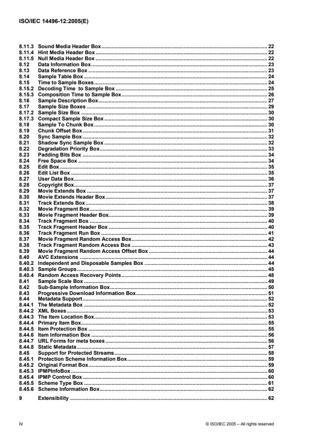 ISO/IEC 14496-12:2005 specifies the structure and uses of the ISO base media file format. The identical text is published as ISO/IEC 15444-12:2005. This file format is used to contain time-based media such as video and audio. The storage of particular coding schemes is defined in specifications that derive from and reference ISO/IEC 14496-12:2005 and ISO/IEC 15444-12:2005, such as the MPEG-4 file format specified in ISO/IEC 14496-14, or the Motion JPEG file format specified in ISO/IEC 15444-3. This file format is designed to contain timed media information for a presentation in a flexible, extensible format that facilitates interchange, management, editing and presentation of the media. This presentation may be "local" to the system containing the presentation, or may be via a network or other stream delivery mechanism. The file format is designed to be independent of any particular network protocol while enabling efficient support for them in general. The file structure is object-oriented; a file can be decomposed into constituent objects very simply, and the structure of the objects inferred directly from their type. This technically identical text is published as ISO/IEC 14496-12:2005 for MPEG-4, and as ISO/IEC 15444-12:2005 for JPEG 2000, and reference to this specification should be made accordingly. The recommendation is to reference one, for example ISO/IEC 14496-12:2005, and append to the reference a parenthetical comment identifying the other, for example "(technically identical to ISO/IEC 15444-12:2005)". This version adds various new tools, including those for content protection, better support of metadata, and better support for advanced coding.