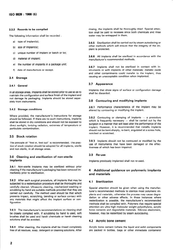 ISO 8828:1988 is a standard published by the International Organization for Standardization (ISO). Its full title is "Implants for surgery — Guidance on care and handling of orthopaedic implants". This standard covers: This standard gives guidance on the procedures for receiving, storing, transporting, handling, cleaning and sterilization of the implants in the clinical range. Guidance on cautions necessary for preparing implants for the use are also outlined. It does not apply to the implant manufacturer.
