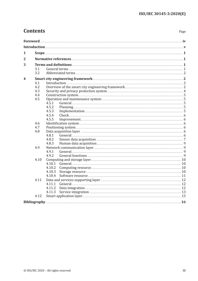 Keywords: ISO/IEC 30145-3:2020, smart city engineering framework, ICT reference framework, data acquisition layer, network communication, computing and storage, data integration, security and privacy, positioning system.