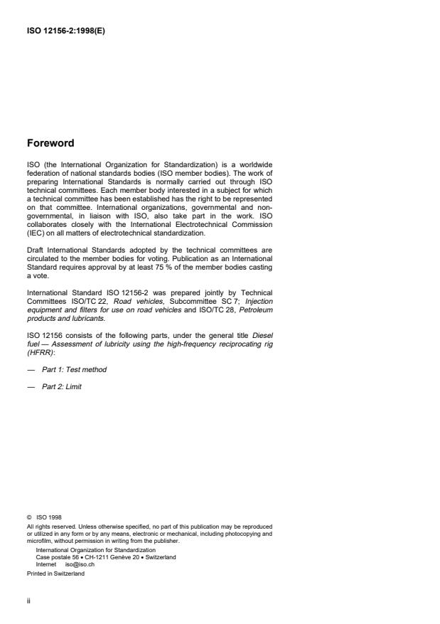 ISO 12156-2:1998 is a standard published by the International Organization for Standardization (ISO). Its full title is "Diesel fuel — Assessment of lubricity using the high-frequency reciprocating rig (HFRR) — Part 2: Limit". This standard covers: Diesel fuel — Assessment of lubricity using the high-frequency reciprocating rig (HFRR) — Part 2: Limit