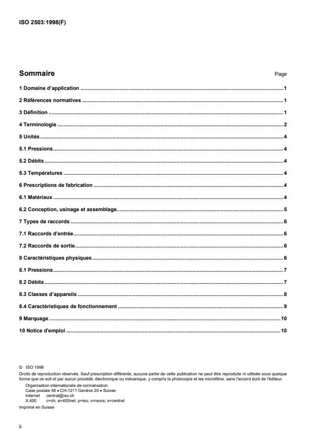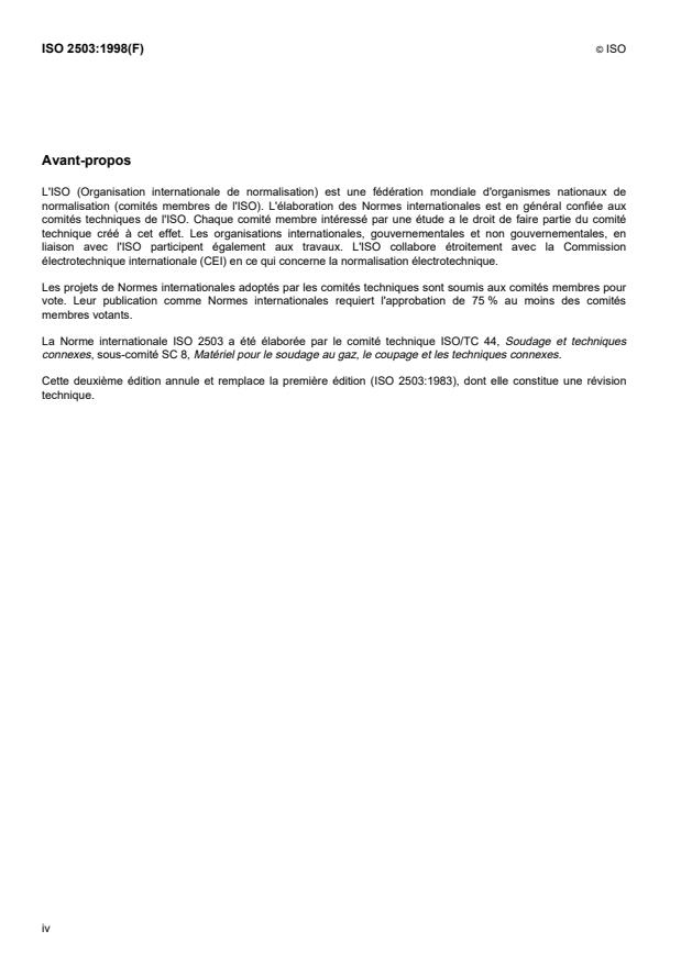 ISO 2503:1998 is a standard published by the International Organization for Standardization (ISO). Its full title is "Gas welding equipment — Pressure regulators for gas cylinders used in welding, cutting and allied processes up to 300 bar". This standard covers: 1.1 La présente Norme internationale prescrit les caractéristiques des détendeurs à simple ou double détente devant être raccordés sur des bouteilles de gaz, normalement employés pour les gaz comprimés jusqu'à 300 bar1) (30 MPa), l'acétylène dissous, les gaz de pétrole liquéfiés (GPL), les mélanges de méthylacétylène-propadiène (MPS) et le dioxyde de carbone (CO2) utilisés pour le soudage, le coupage et les techniques connexes.