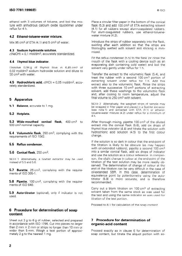 ISO 7781:1996 is a standard published by the International Organization for Standardization (ISO). Its full title is "Rubber, raw styrene-butadiene — Determination of soap and organic-acid content". This standard covers: Describes a method for the determination of the soap and organic-acid content of raw styrene-butadiene rubber (SBR). The method depends on the extraction of the organic acids and soaps from the rubber by means of a solvent. Recommends to determine both contents on separate portions of the same solvent extract; gives only an approximative value. Replaces the first edition.