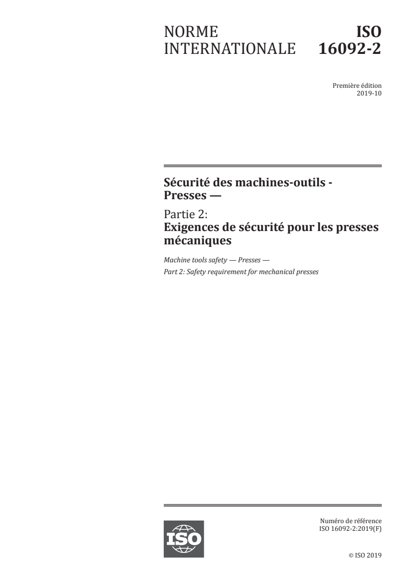 ISO 16092-2:2019 - Sécurité des machines-outils - Presses