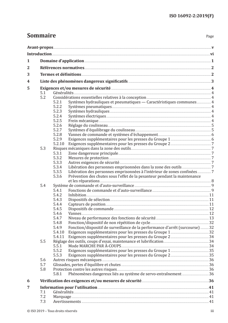 Le présent document, appliqué avec l'ISO 16092‑1, spécifie les exigences techniques de sécurité et les dispositions que doivent respecter les personnes chargées de la conception, de la construction et de la fourniture des groupes suivants de presses mécaniques et de systèmes de production des presses mécaniques: — Groupe 1: Presses à embrayage à friction; — Groupe 2: Presses avec un système de servo-entraînement (servopresses mécaniques). NOTE 1 Les exigences du présent document s'appliquent essentiellement à ces deux groupes de presse mécanique. Lorsqu'une exigence ne s'applique qu'à un seul groupe, celui-ci est alors spécifié. NOTE 2 D'autres types de systèmes d'entraînement motorisés offrent des fonctionnalités similaires à ce que l'on appelle communément les «systèmes de servo-entraînement» ou «servomoteurs», et leur utilisation est donc considérée comme identique dans les termes utilisés dans le présent document (par exemple, les systèmes d'entraînement à fréquence variable). Les presses couvertes par le présent document vont des petites machines à grande vitesse avec un seul opérateur produisant de petites pièces aux grandes machines à vitesse relativement lente avec plusieurs opérateurs et produisant de grandes pièces complexes. Le présent document traite de tous les phénomènes dangereux significatifs applicables aux presses mécaniques et dispositifs auxiliaires (par exemple: les coussins mobiles, les éjecteurs de pièces et les systèmes d'alimentation et de transfert) qui font partie intégrante de la machine, lorsqu'elles sont utilisées normalement et dans les conditions de mauvais usage raisonnablement prévisible par le fabricant (voir l'Article 4). Toutes les phases du cycle de vie de la machine, telles que décrites dans l'ISO 12100:2010, 5.4 ont été prises en compte. NOTE 2 L'expression «tous les phénomènes dangereux significatifs» fait référence à ceux qui sont identifiés ou associés aux presses au moment de la publication du présent document. Outre les machines non couvertes par l'ISO 16092‑1:2017, le présent document ne couvre pas les machines qui: a) transmettent de l'énergie pour donner un mouvement du coulisseau de la presse en utilisant des moyens hydrauliques ou pneumatiques; b) ont deux ou plusieurs coulisseaux mobiles dans différentes positions angulaires les uns par rapport aux autres; NOTE 3 Le présent document s'applique aux presses qui ont deux ou plusieurs coulisseaux mobiles dans le même positionnement angulaire, par exemple, une presse qui a des coulisseaux intérieurs et extérieurs. c) transmettent de l'énergie pour donner un mouvement du coulisseau de la presse en utilisant un ou des mécanisme(s) de moteur linéaire(s).