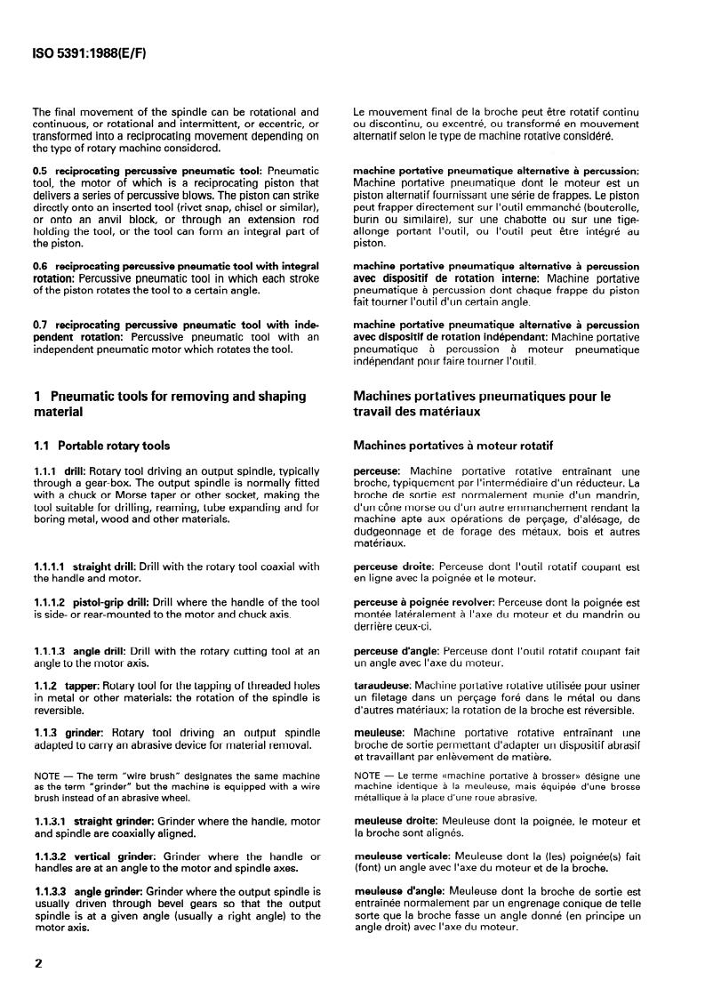 ISO 5391:1988 is a standard published by the International Organization for Standardization (ISO). Its full title is "Pneumatic tools and machines — Vocabulary". This standard covers: Establishes terms and definitions in English and French for the categories as follows: general, tools for removing and shaping material (portable and fixed: rotary and percussive), tools for assembly work ( portable: rotary and reciprocating percussive ), tools for lifting, vibrators. Alphabetical indexes in English and French are also included.