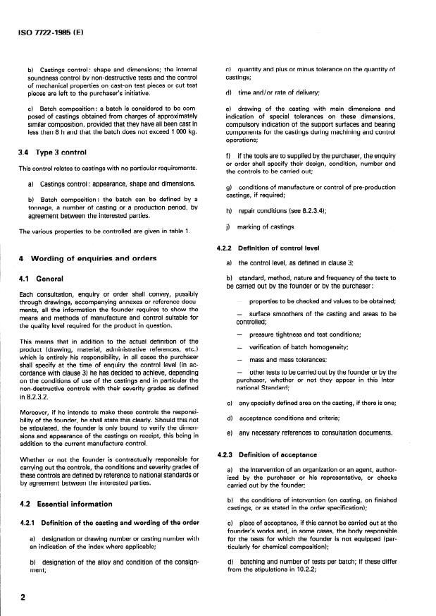 ISO 7722:1985 is a standard published by the International Organization for Standardization (ISO). Its full title is "Aluminium alloy castings produced by gravity, sand, or chill casting, or by related processes — General conditions for inspection and delivery". This standard covers: This document specifies the conditions for ordering, and the conditions for producing, testing and accepting castings. Moreover, it gives casting methods and heat treatment, shape and dimensions and marking. It applies to all aluminium alloy gravity castings.