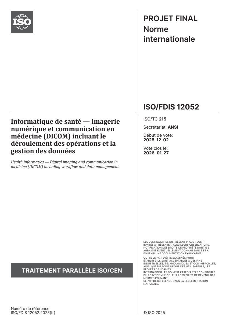 ISO/FDIS 12052 - Informatique de santé — Imagerie numérique et communication en médecine (DICOM) incluant le déroulement des opérations et la gestion des données Released:20. 12. 2025