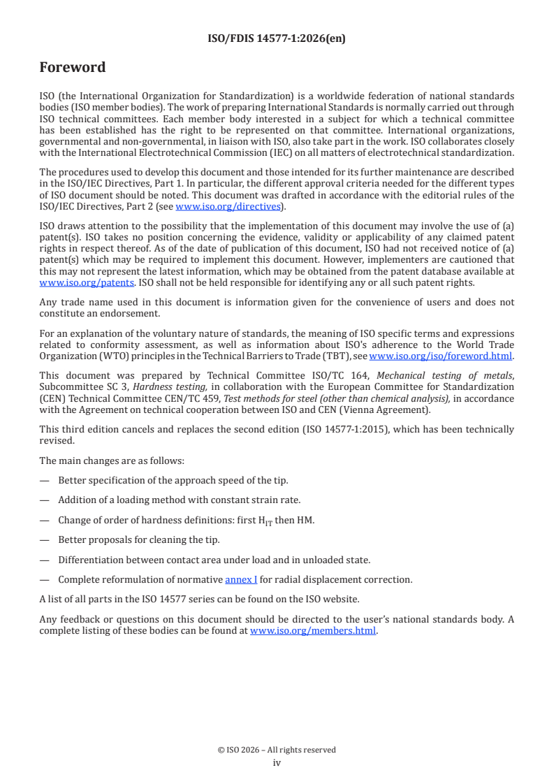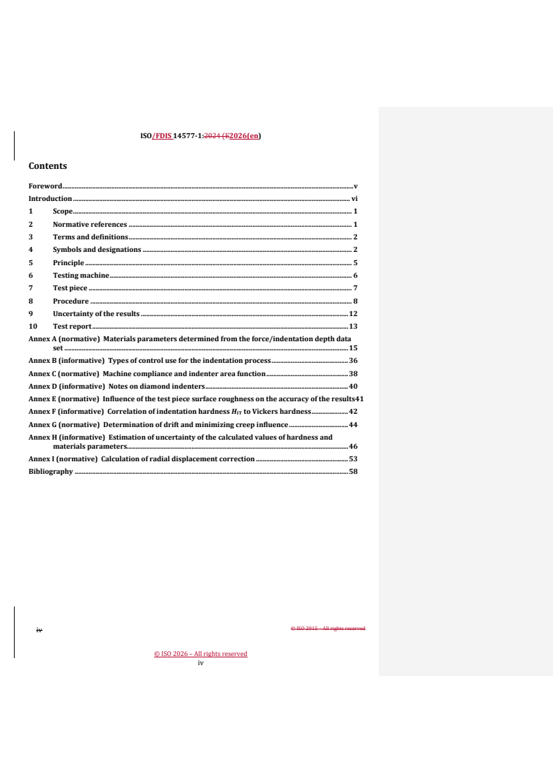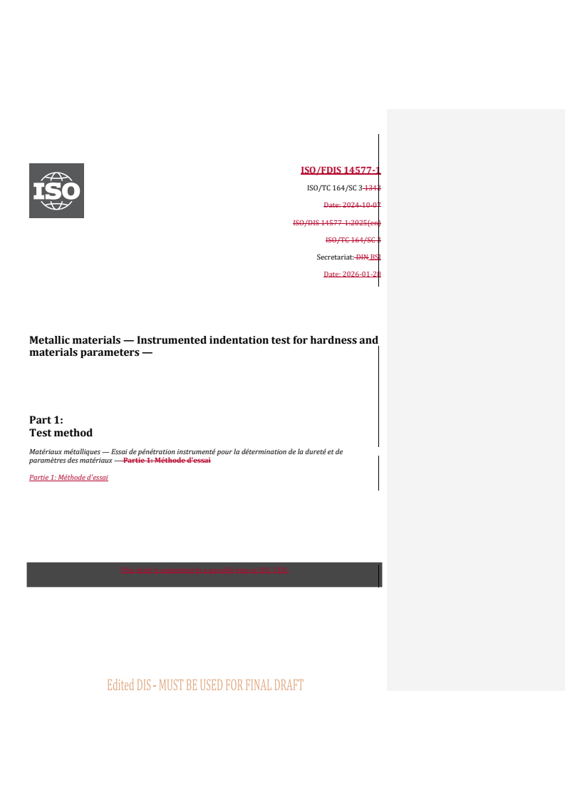 REDLINE ISO/FDIS 14577-1 - Metallic materials — Instrumented indentation test for hardness and materials parameters — Part 1: Test method Released:30. 01. 2026