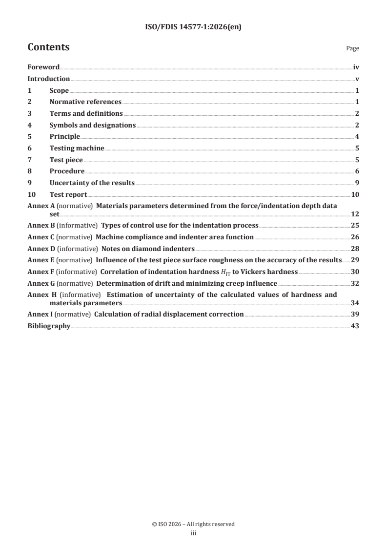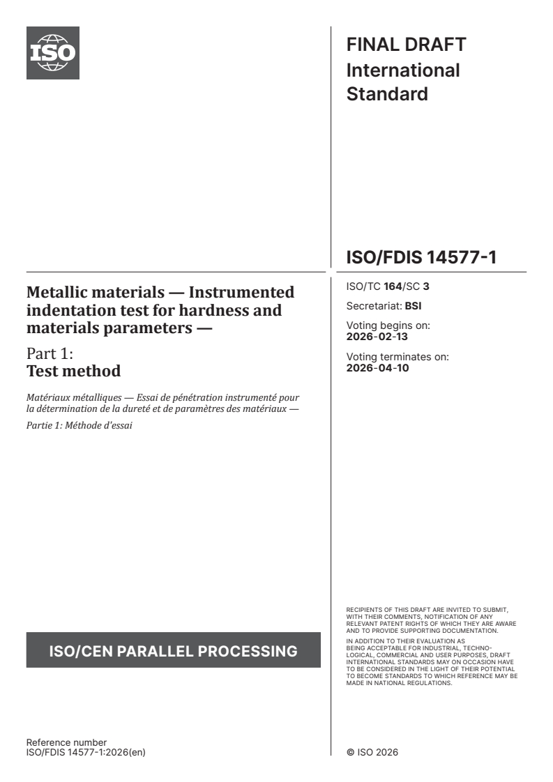 ISO/FDIS 14577-1 - Metallic materials — Instrumented indentation test for hardness and materials parameters — Part 1: Test method Released:30. 01. 2026