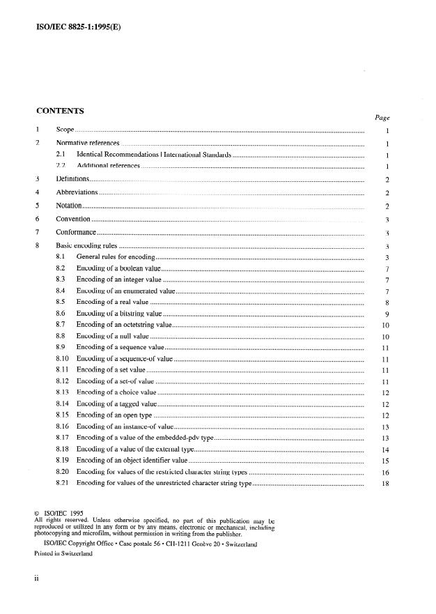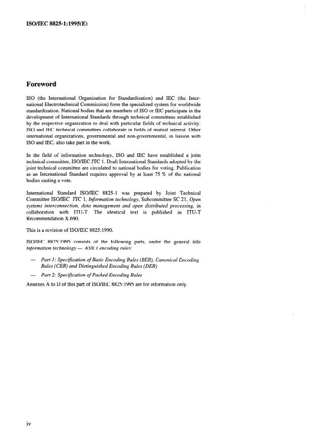 ISO/IEC 8825-1:1995 is a standard published by the International Organization for Standardization (ISO). Its full title is "Information technology — ASN.1 encoding rules: Specification of Basic Encoding Rules (BER), Canonical Encoding Rules (CER) and Distinguished Encoding Rules (DER)". This standard covers: Information technology — ASN.1 encoding rules: Specification of Basic Encoding Rules (BER), Canonical Encoding Rules (CER) and Distinguished Encoding Rules (DER)